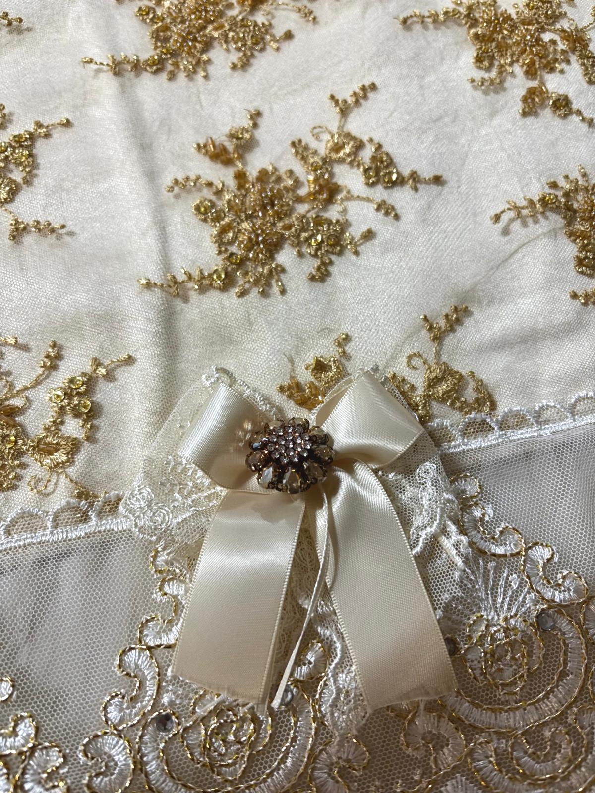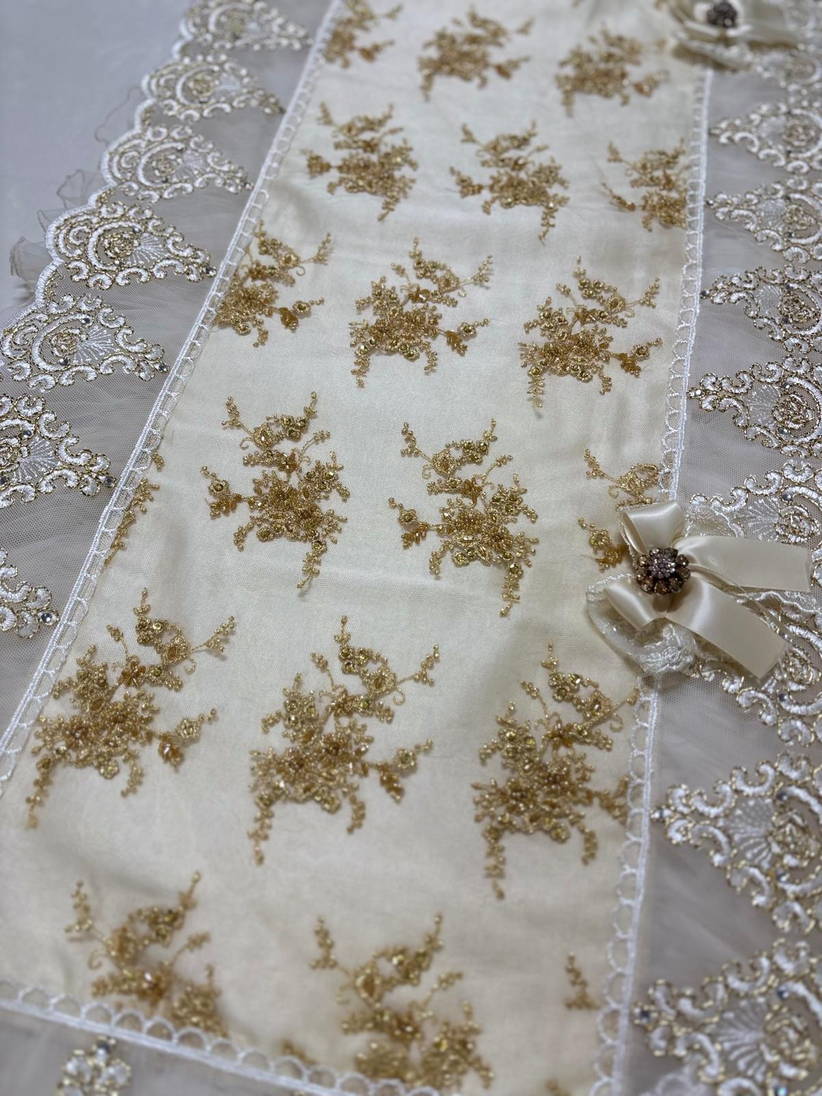 Runner trapuntato avorio e oro con tulle decorato con pizzo sposa oro, con pizzo rebrodè con brillantini e con fiocchi in raso avorio.