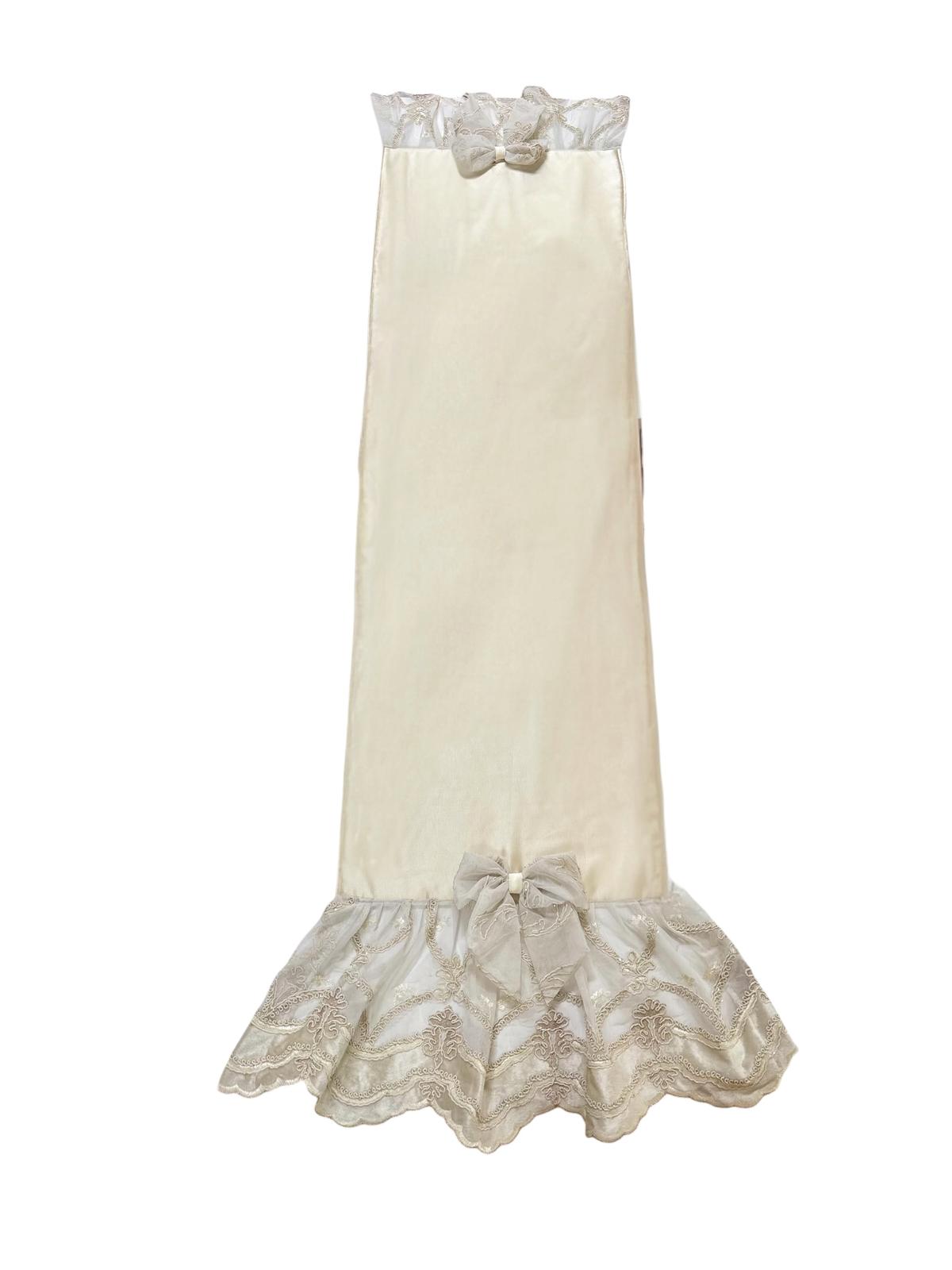 Runner panna in damasco in seta decorato con pizzo macramè e con fiocco in tulle oro.