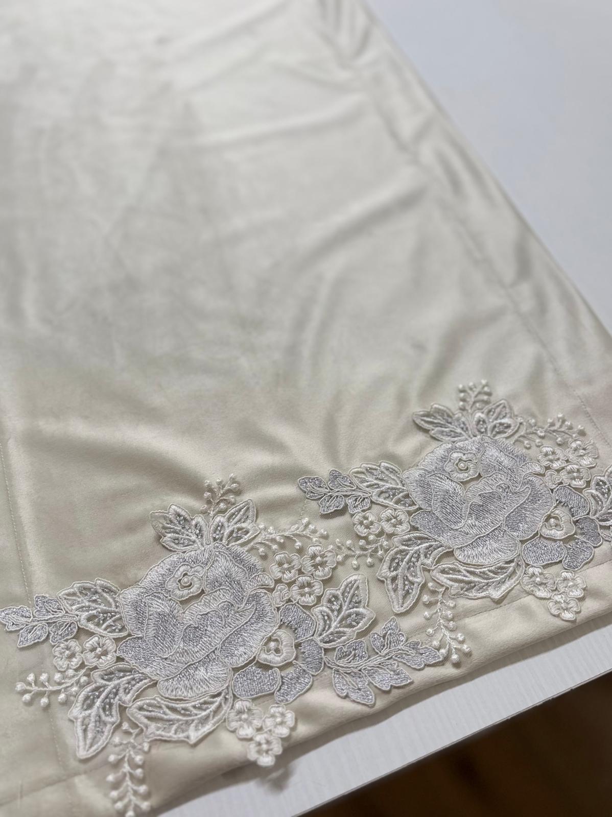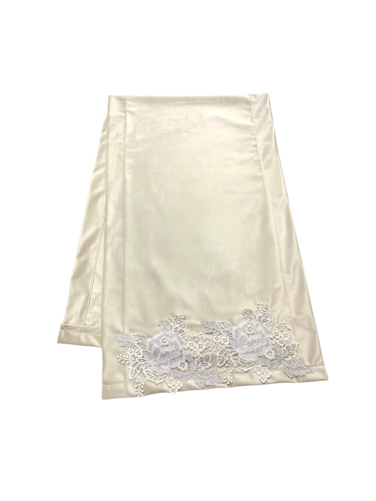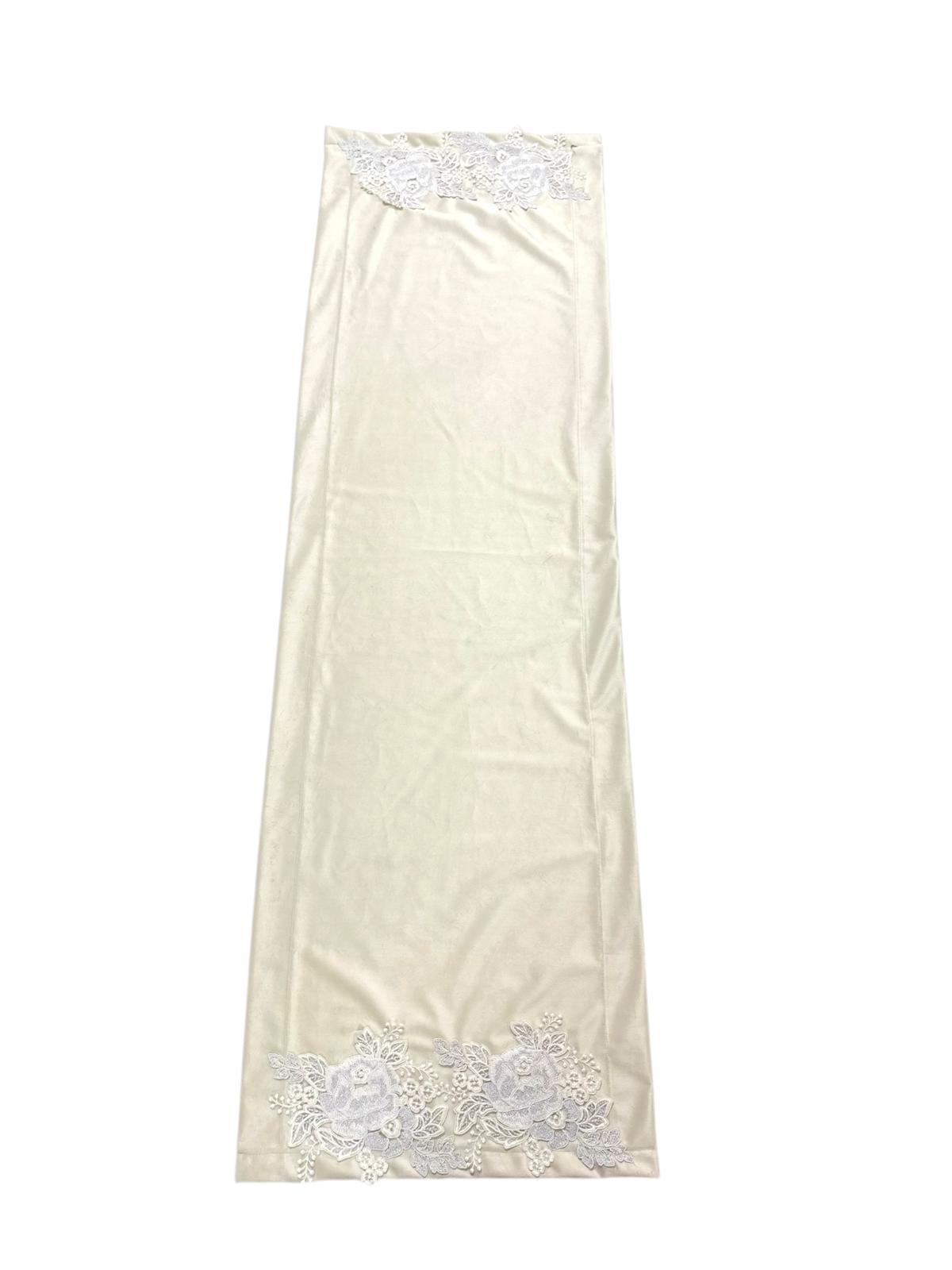 Runner avorio in velluto decorato con pizzo argento.