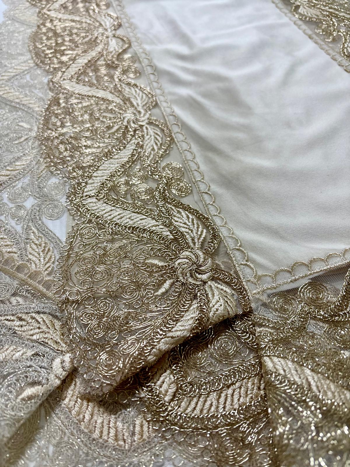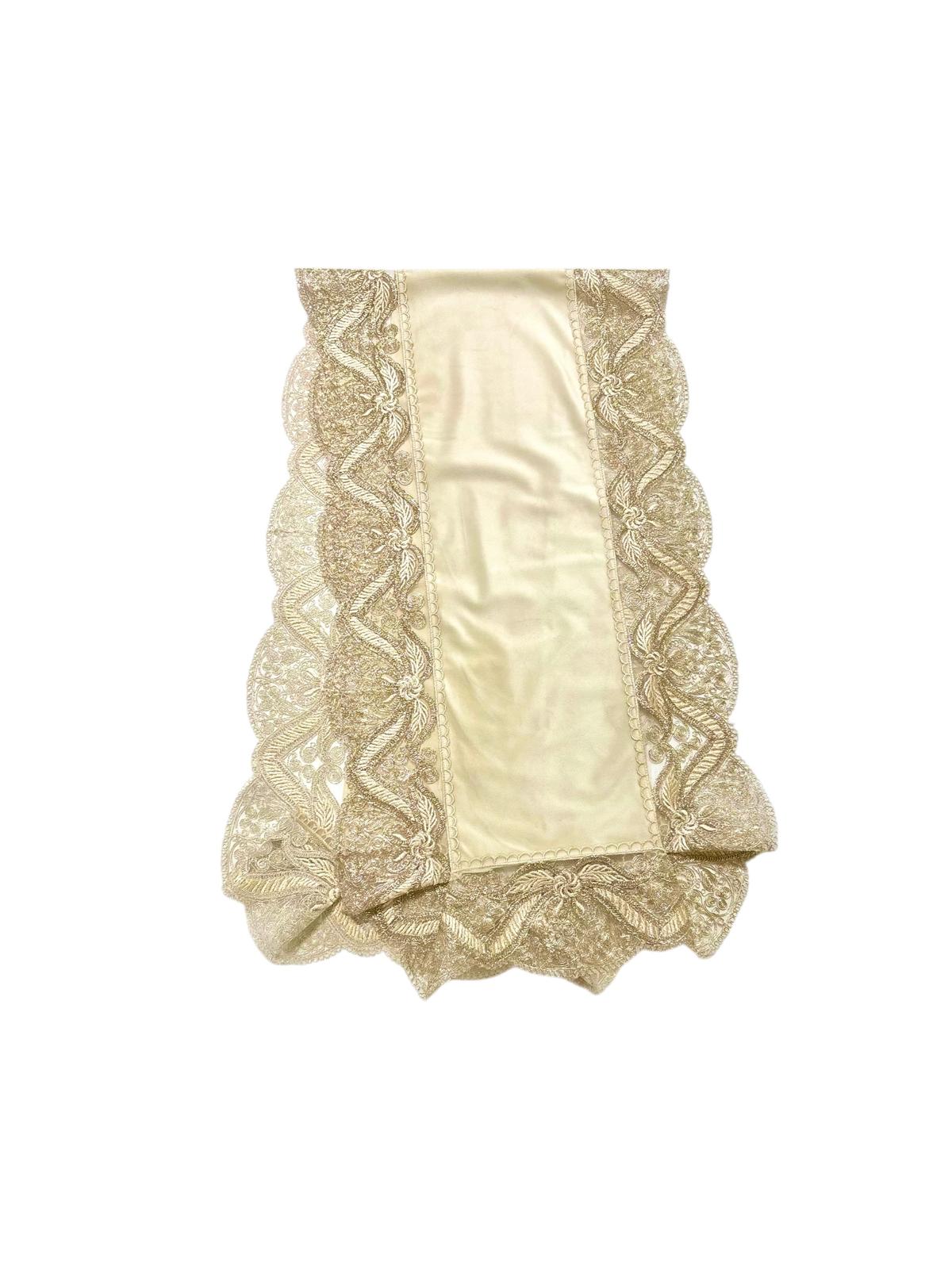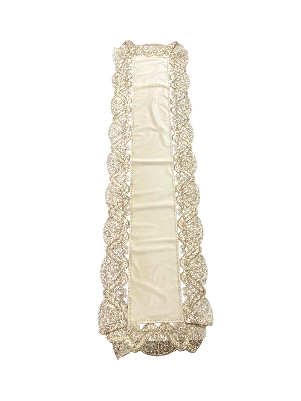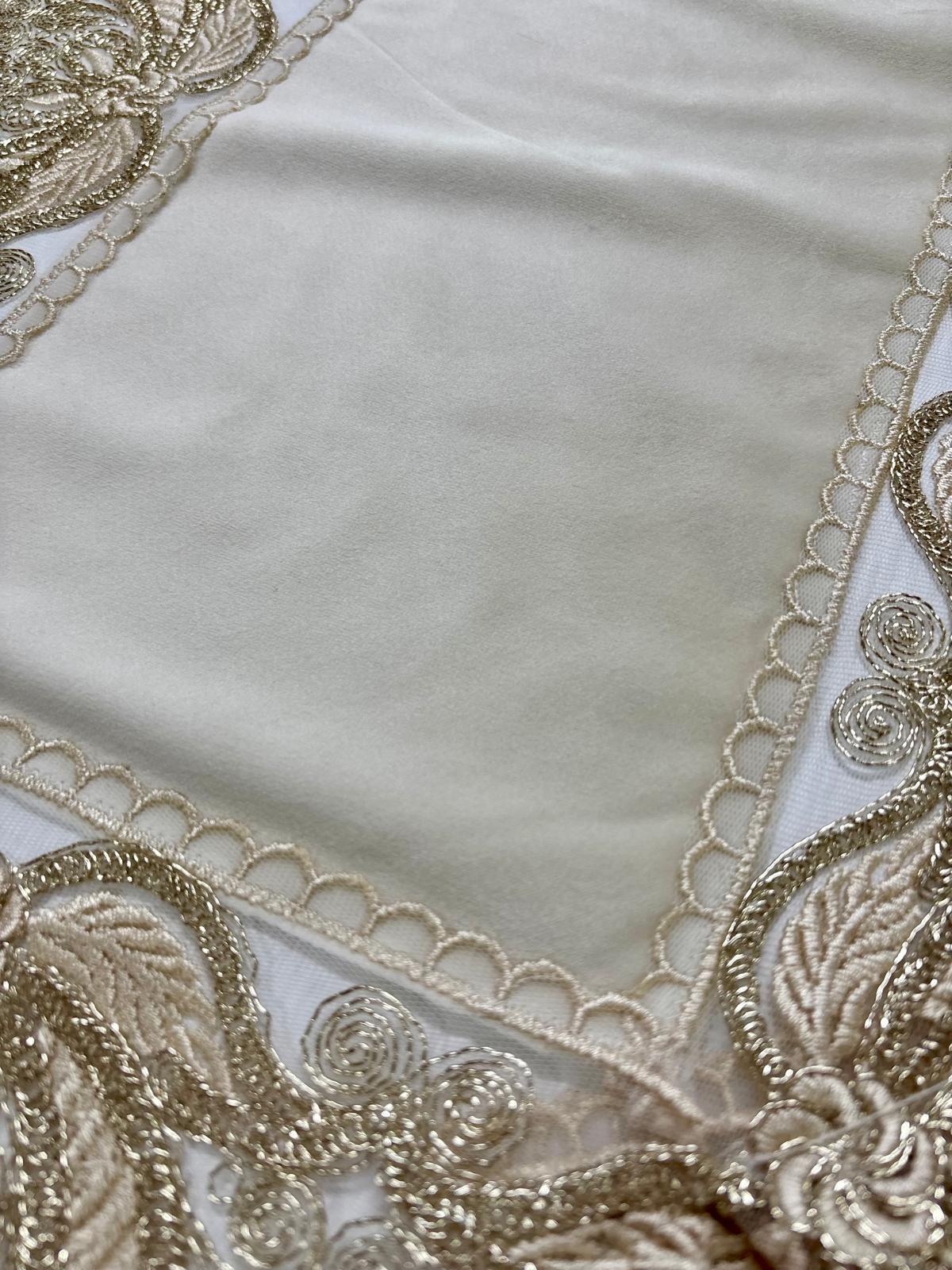Runner avorio in velluto con pizzo dorato. Lavorazione artigianale.