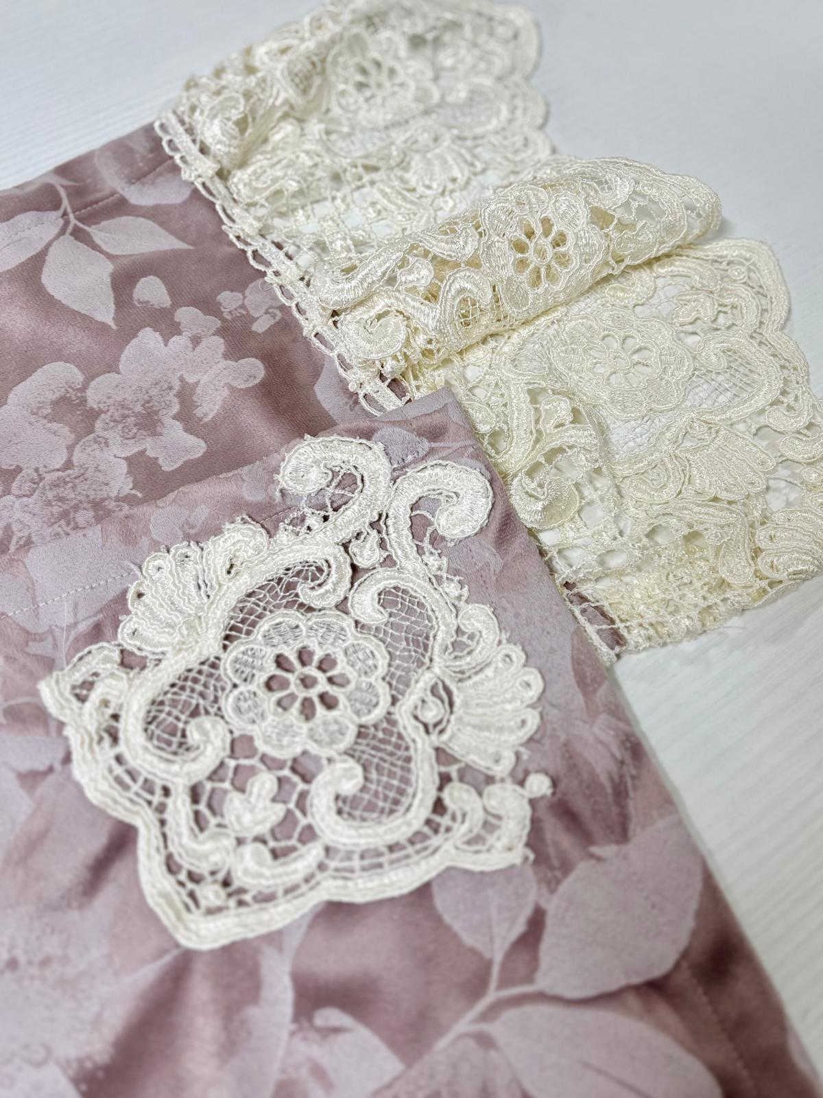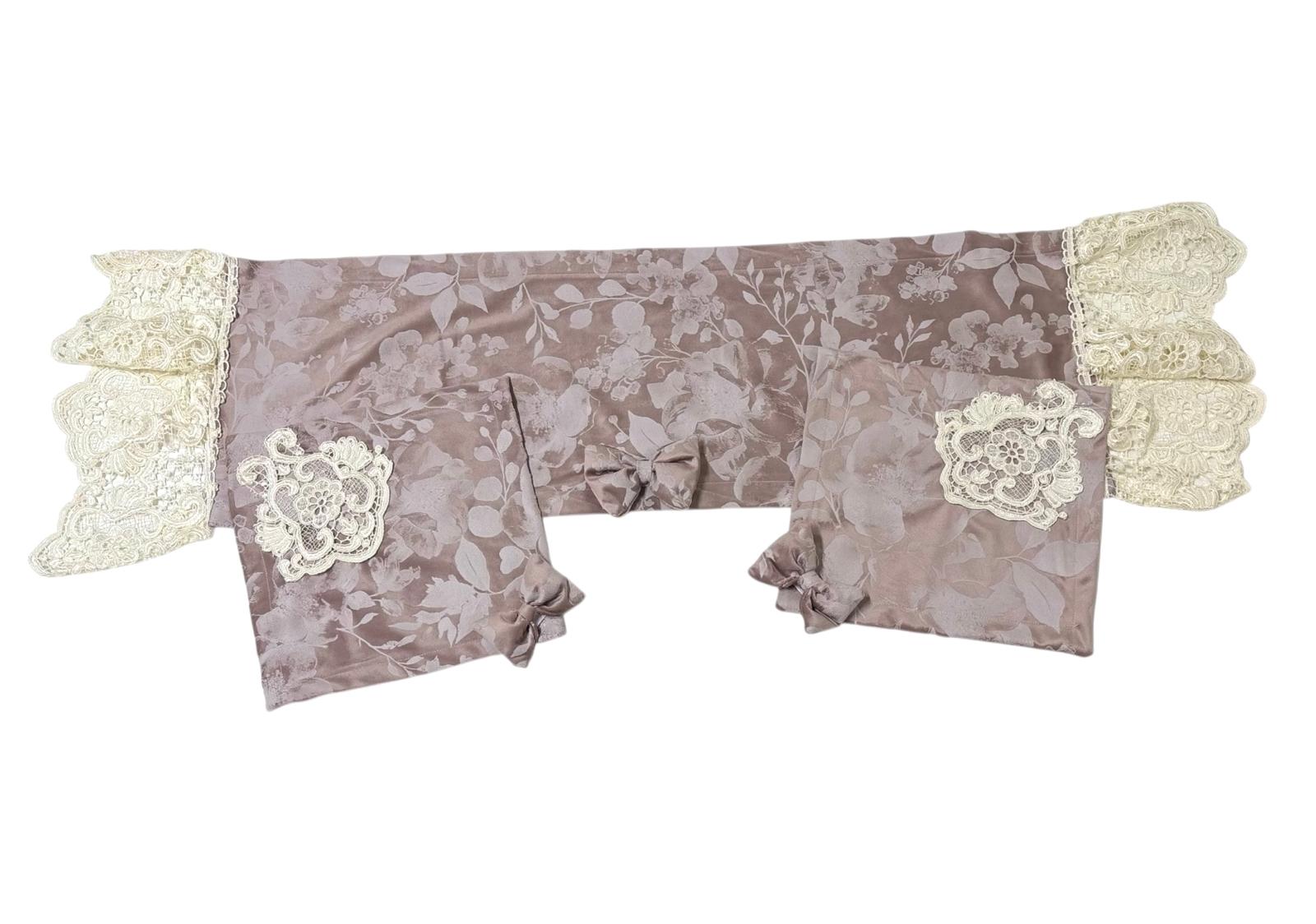 Tris centri glicine in velluto con stampa, decorati con fiochi coordinati e con pizzo avorio.