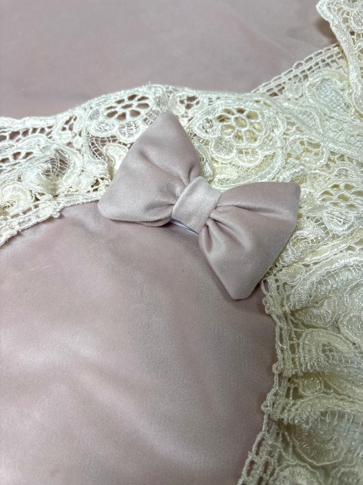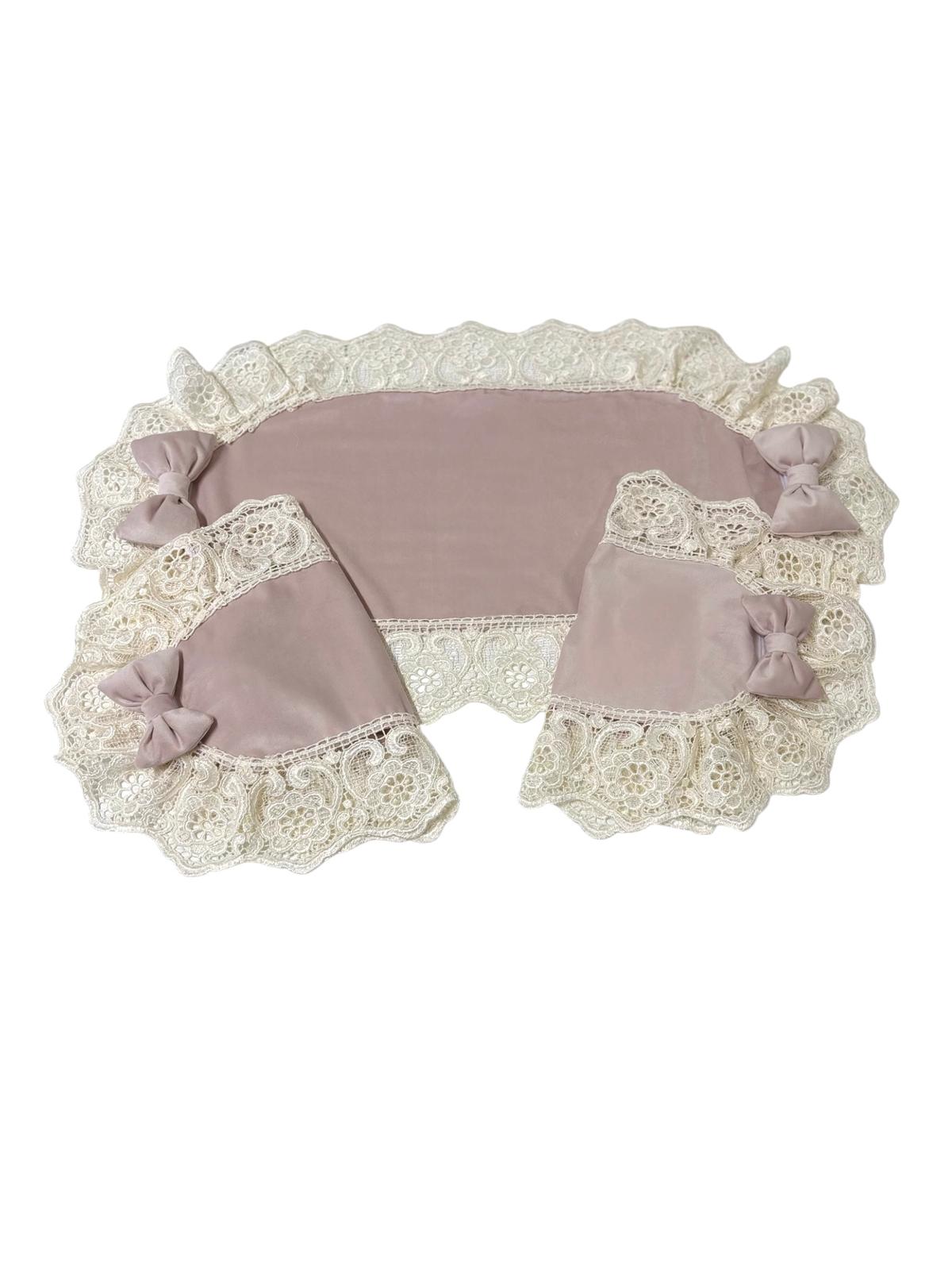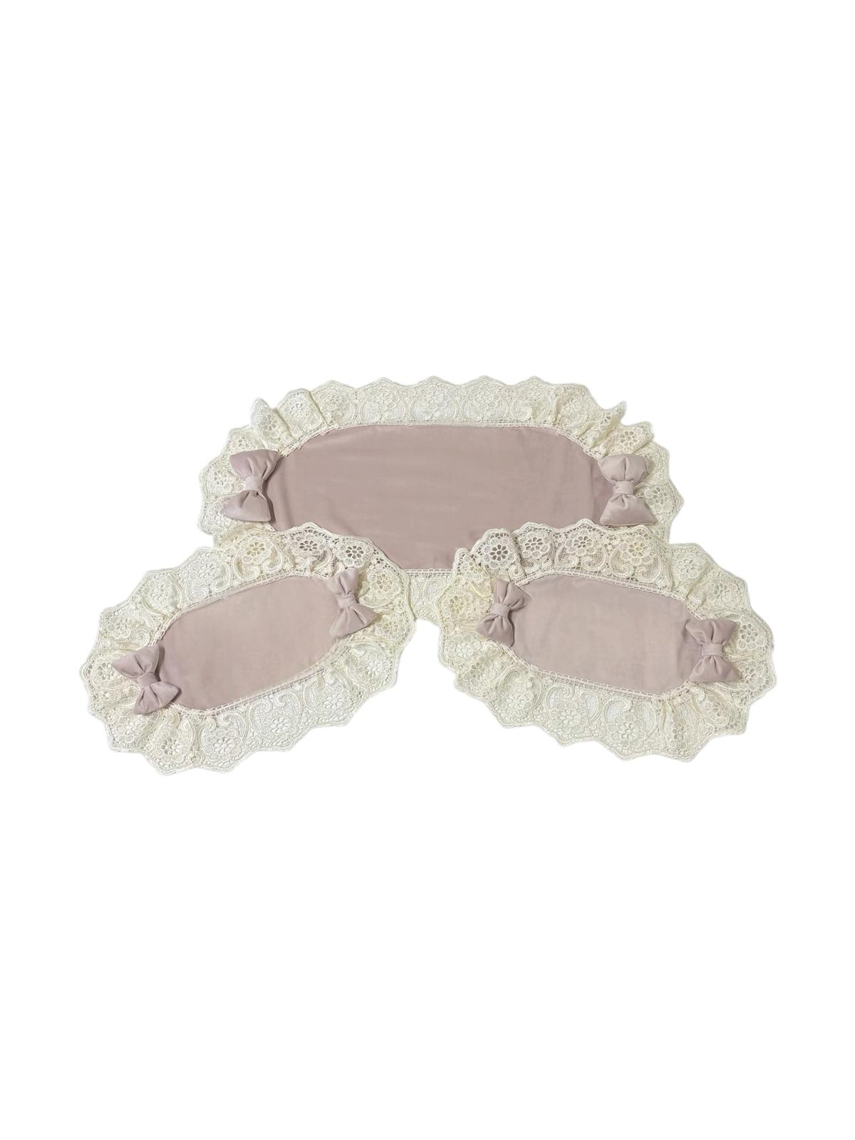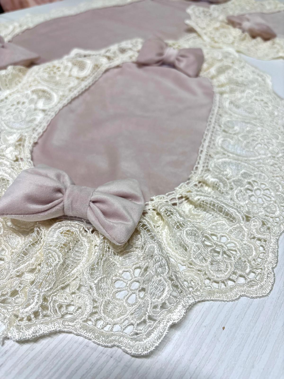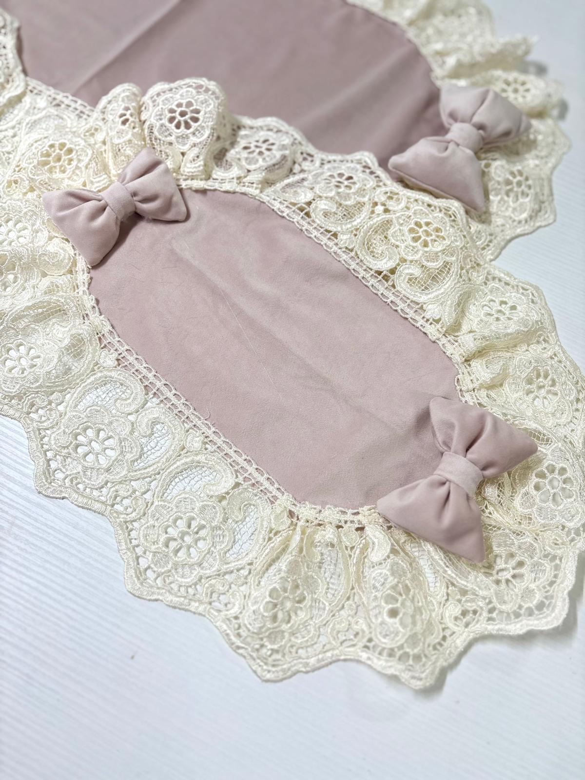 Tris centri rosa in velluto decorati con fiocchi coordinati e con pizzo ricamato avorio.